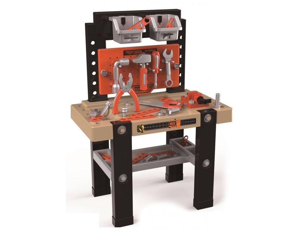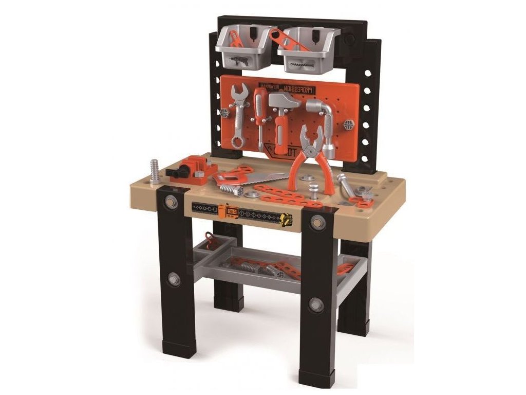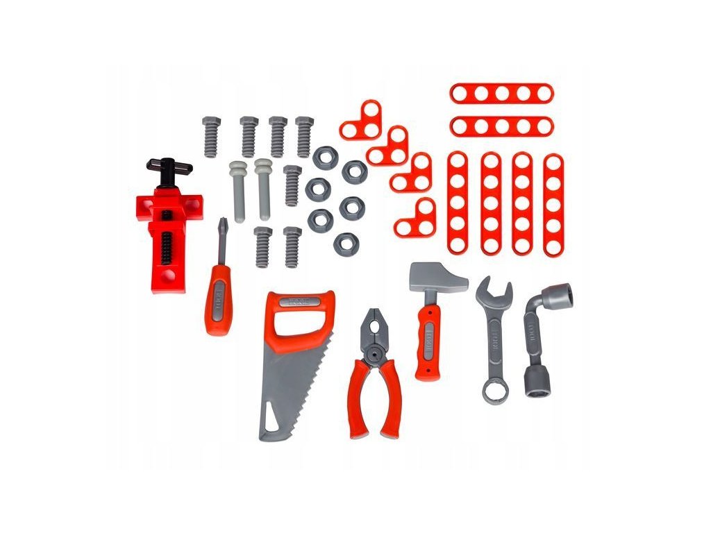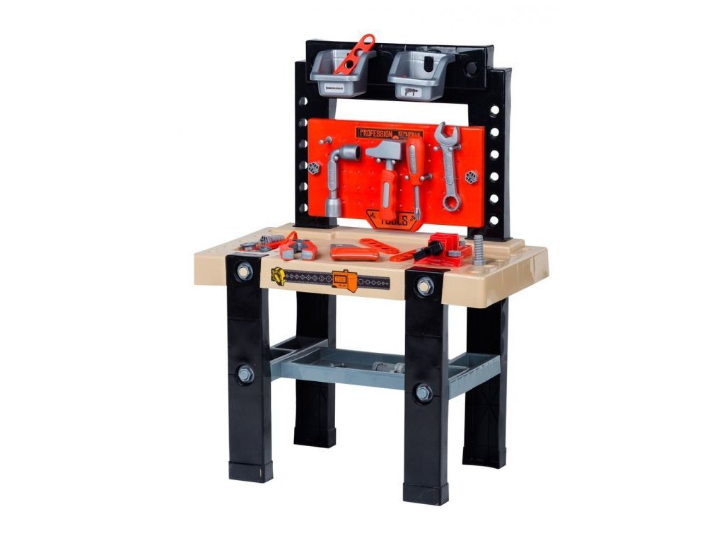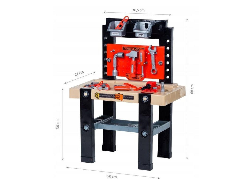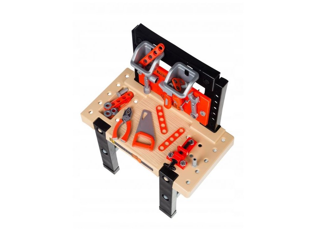 Hračka je vyrobena z bezpečného, odolného plastu a připomíná skutečný pracovní stůl. Sada obsahuje až 50 různých prvků. Na ní visí stěna s nástroji: kladivo, klíč, šroubovák, pila a linkařské pily. Na stole jsou speciální otvory, do kterých můžete našroubovat speciální konektory a šrouby. Na stole najdete také různé organizátory a svěrák.