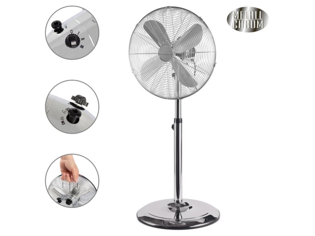 Stojanový ventilátor v kvalitním provedení z nerezové oceli a s nastavením úhlu sklonu. Vhodný pro nejrůznější použití. Vhodný do kanceláře, obýváku i ložnice.