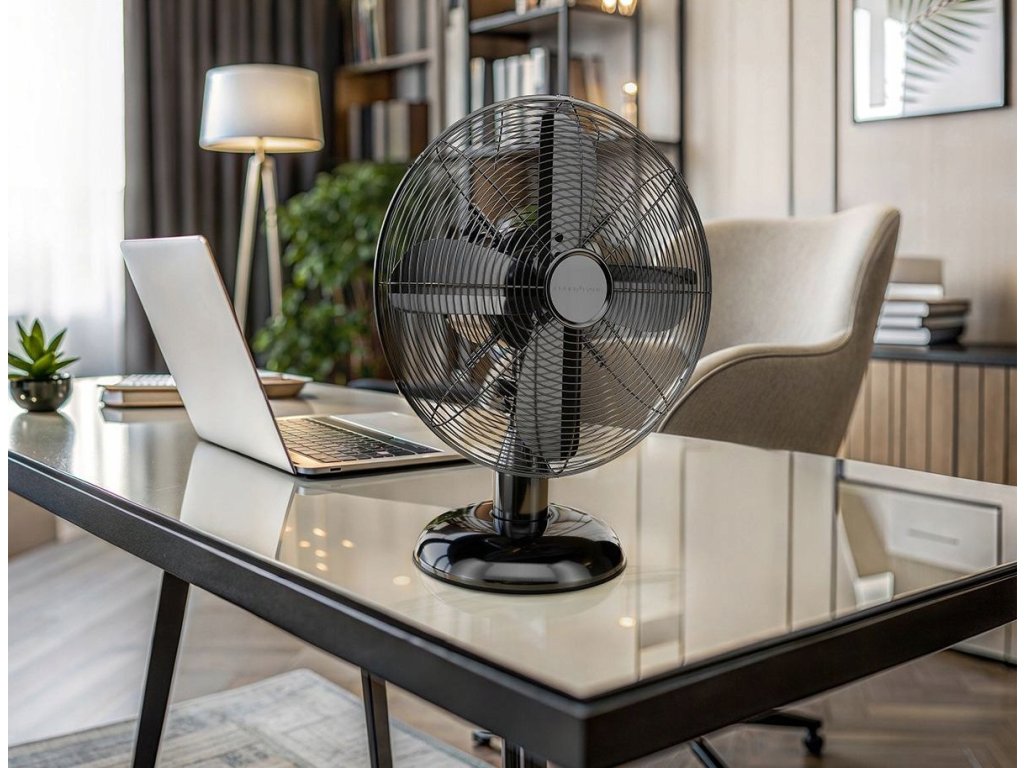 Elegantní a vysoce funkční stolní ventilátor s retro designem. Pochromované pouzdro se hodí do místností zařízených v jakémkoli stylu. Ventilátor o průměru 30 cm účinně ochladí vzduch v horkých dnech.