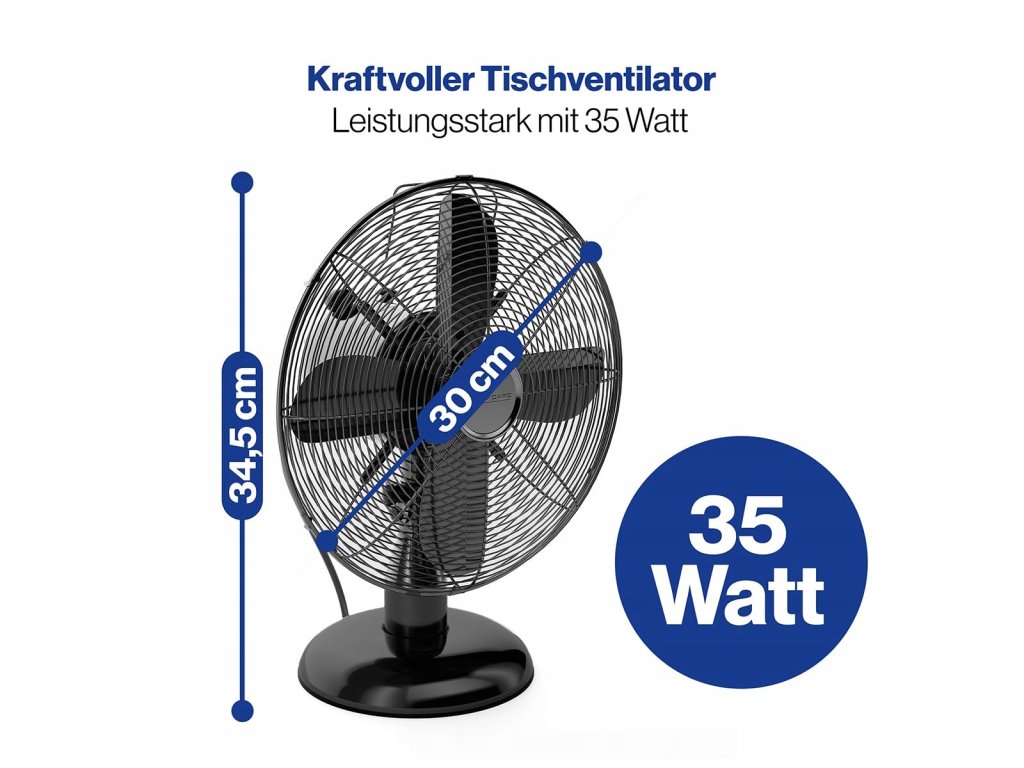 Elegantní a vysoce funkční stolní ventilátor s retro designem. Kovové pouzdro se hodí do místností zařízených v jakémkoli stylu. Ventilátor o průměru 30 cm účinně ochladí vzduch v horkých dnech. Stabilní kovové a odolné tělo je zárukou odolnosti.
