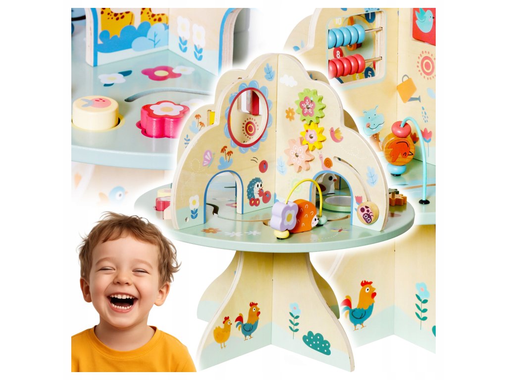 Díky různým aktivitám – od barevných ozubených kol a počítadla, přes motorické smyčky, až po posuvné prvky – stůl rozvíjí manuální dovednosti, koordinaci a logické myšlení dítěte.