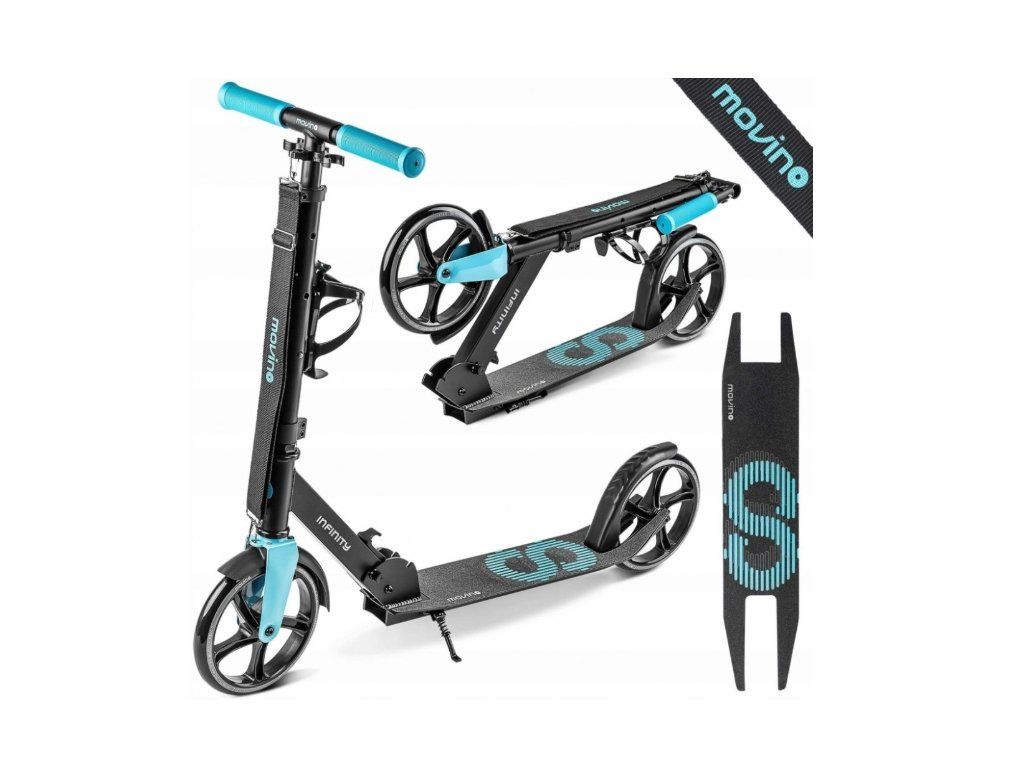 Movino Infinity je městská koloběžka vytvořená pro děti i dospělé. Nízká zavěšená plošina (7 cm od země). V horkých dnech můžete použít držadlo na láhev s vodou na řídítkách. Celek se snadno skládá a přenáší.