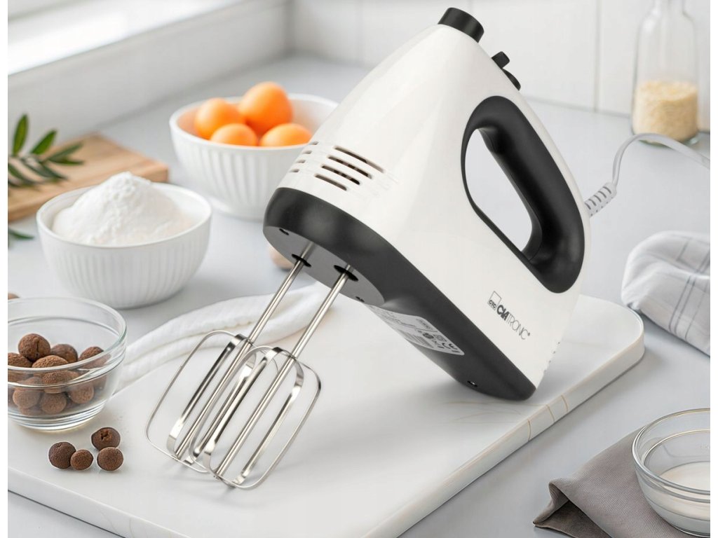Sladké dezerty a dokonalé těsto s ručním šlehačem Clatronic HM 3775. Jediný přístroj zvládne šlehat pevný sníh a s hnětacími háky připravit perfektní těsto pro domácí kynuté koláče.