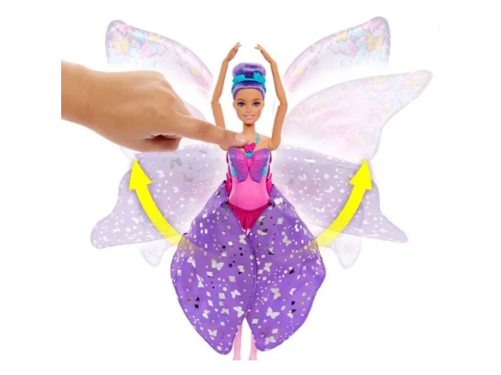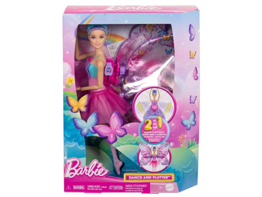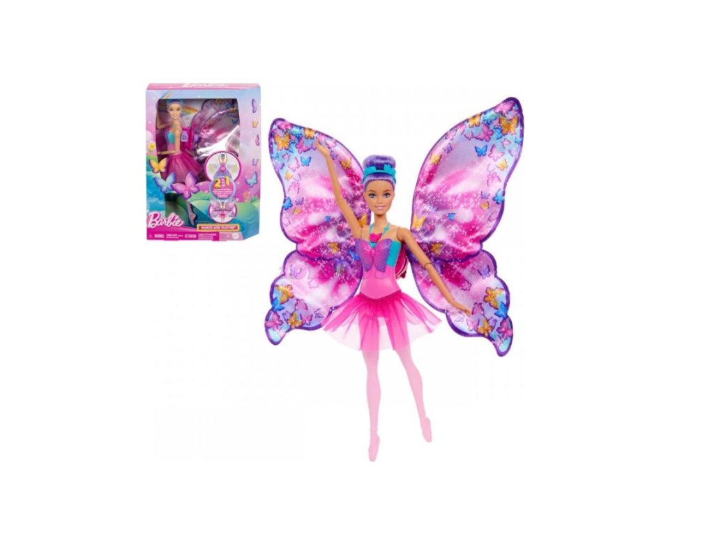 Barbie® Tanečnice s motýlími křídly podněcuje fantazii a nabízí kouzelnou proměnu 2 v 1! Stačí stisknout náhrdelník na živůtku panenky a sledovat, jak se její fialová svrchní sukně jako kouzlem rozvine do velkých třpytivých motýlích křídel. Děti si užijí tento parádní okamžik, který si budou rády opakovat znovu a znovu. Okouzlující fialový účes ve formě drdolu s květinovou čelenkou, oslnivý živůtek a baletní střevíčky dotvářejí její úžasný vzhled.